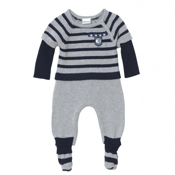 3 Pommes boys coverall set from “ navy dog” collection. Navy and light grey knitted coverall. Layered look with navy and grey striped top, navy long sleeves and solid grey bottom with navy ribbed hem. Detail patch on the chest. Matching navy and grey striped booties included. Button strip in front and snaps at the bottom. Made of 100% cotton.