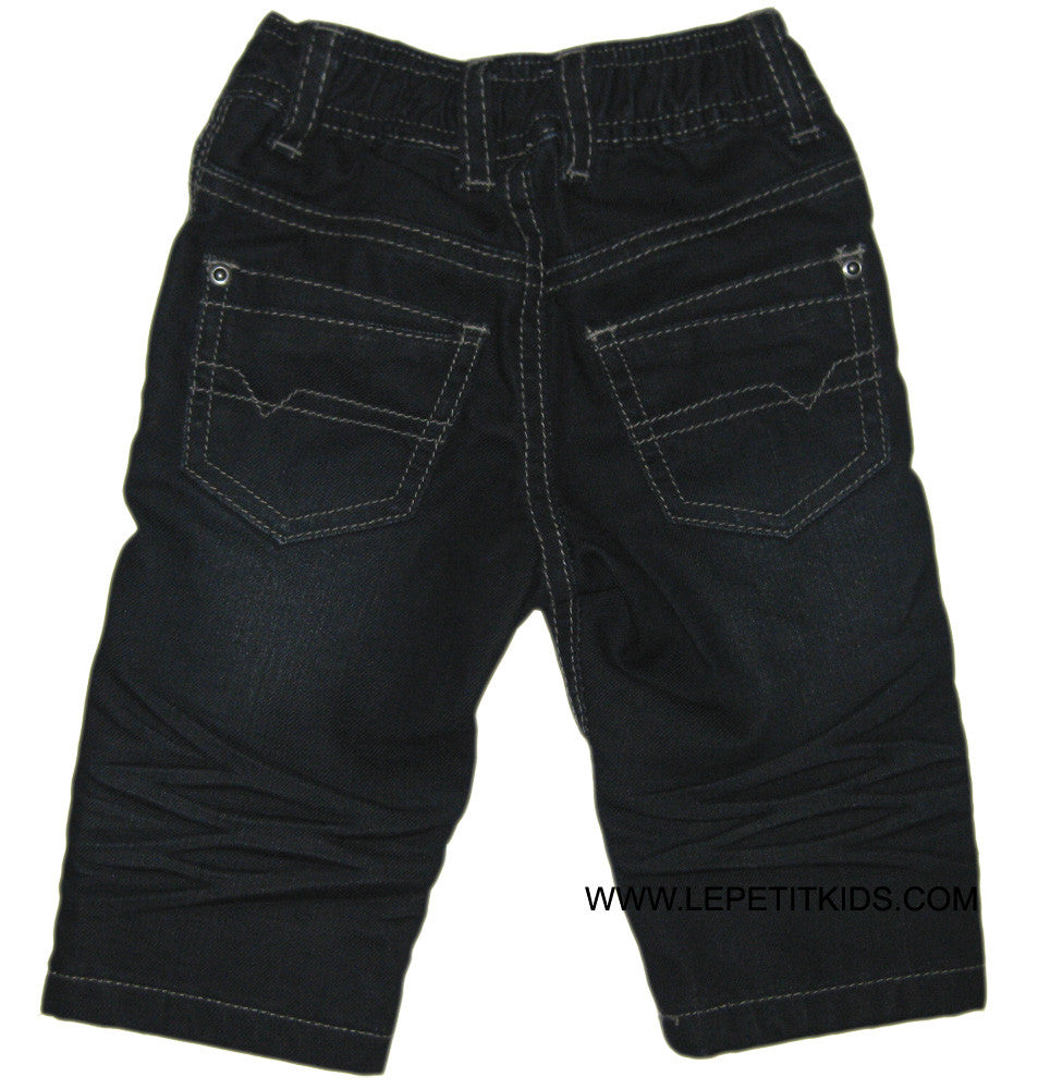 3 Pommes black denim pants with back pockets. Elastic waistband with button front.