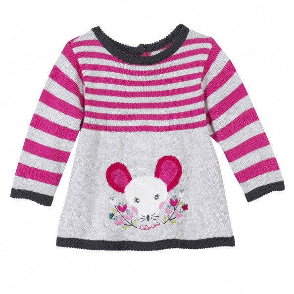 Catimini adorable knitted cardigan/sweater for baby girls from “Urban” collection. Can be worn as a cardigan buttons on front and colorful embroidery by hemline. Or wear it as a sweater with large mouse embroidery on front. Charcoal grey scalloped neckline, cuffs and bottom hemline. Material is 40%viscose, 31%polyamide, 29%cotton knit.