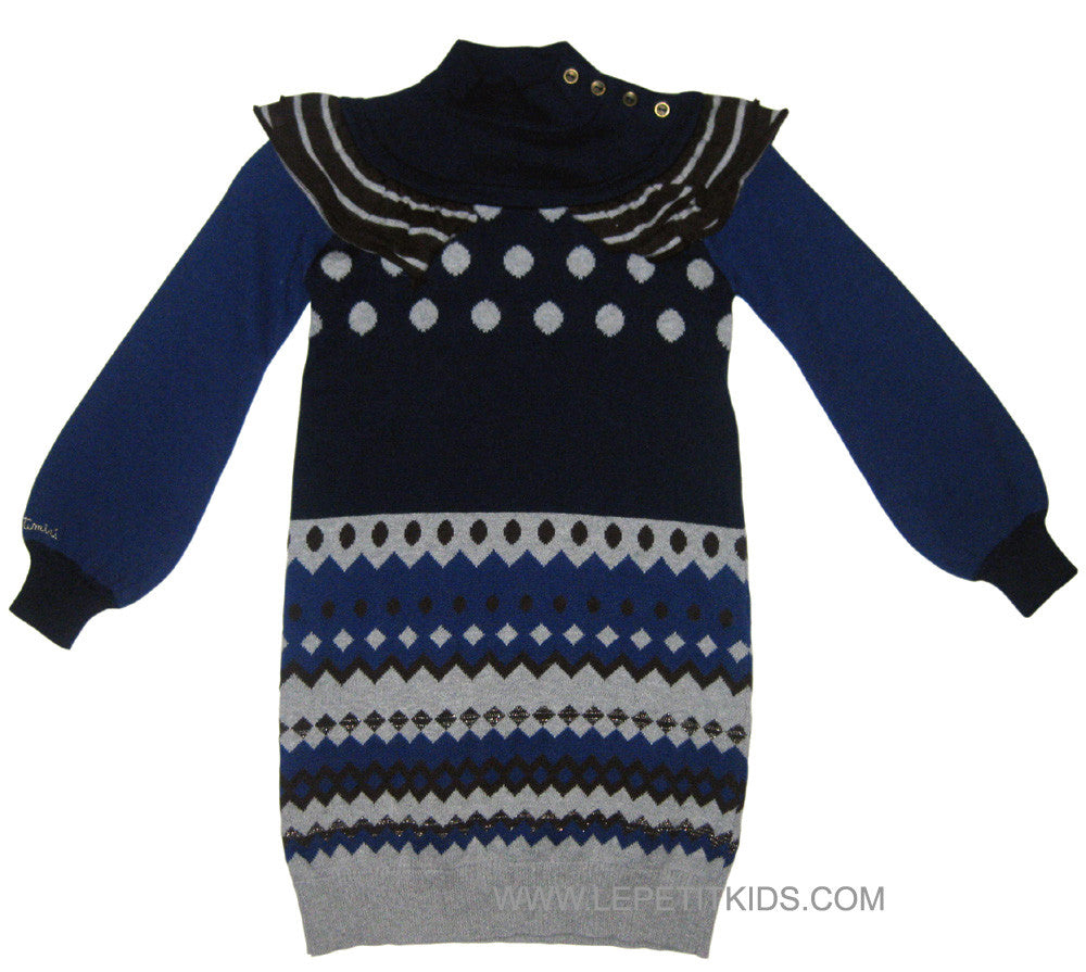 Catimini beautiful knit dress in shades of blue and grey. Ruffle detail over long sleeve. Nice fit and buttons at side neck.