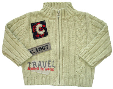 Confetti zip front cardigan in ivory thick cable knit. Fun badges on side front.