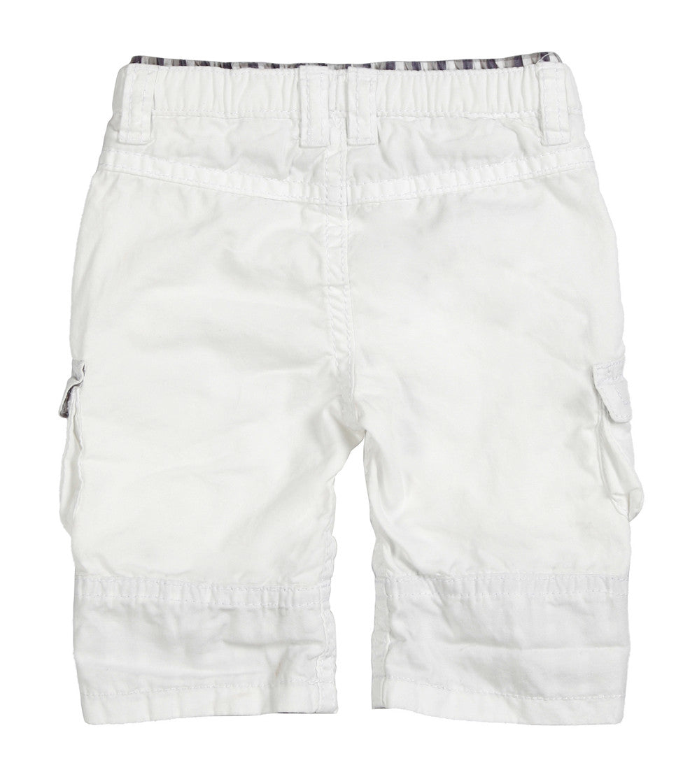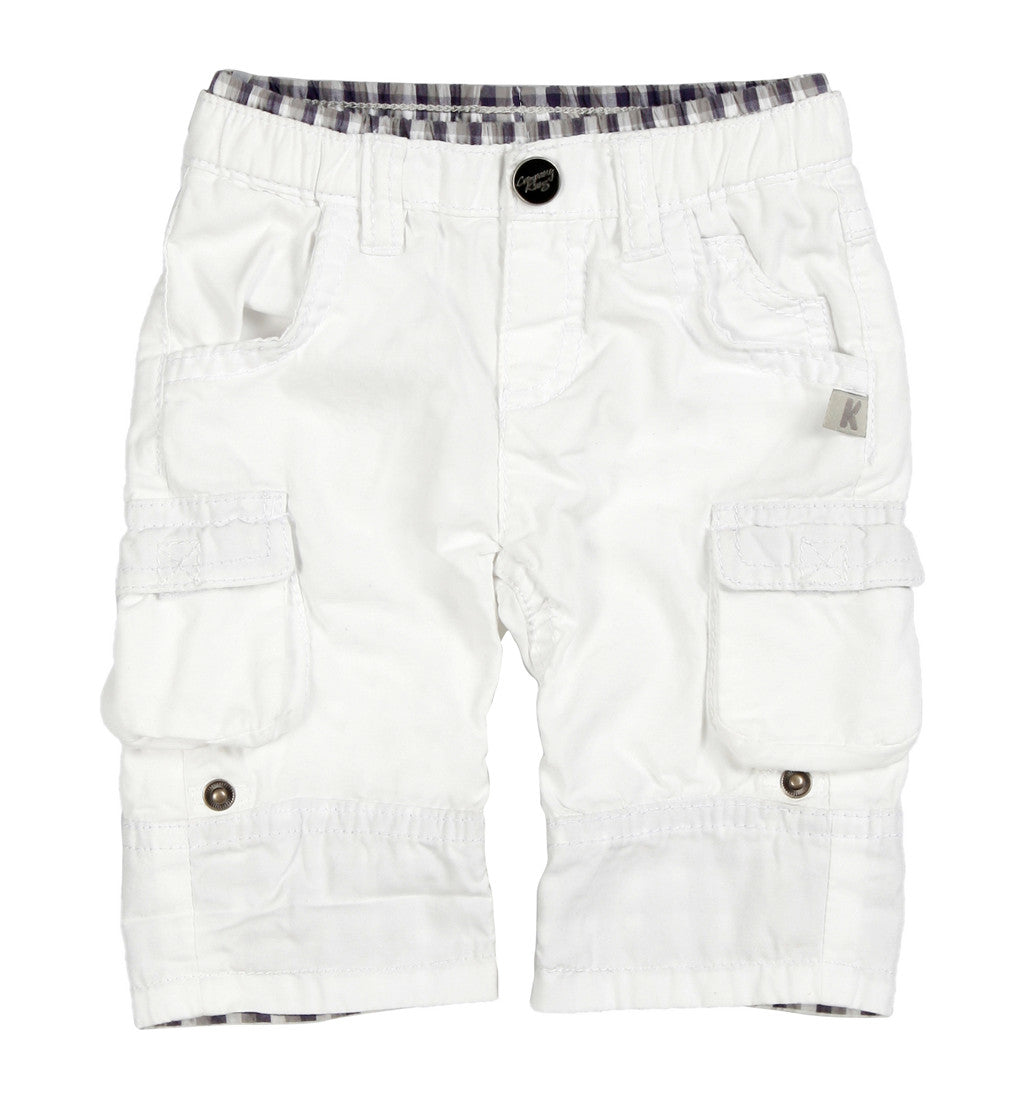 Kanz pants in white cotton with side cargo pockets. Black & white checked waistband and lining on legs to cuff for a pop of color.