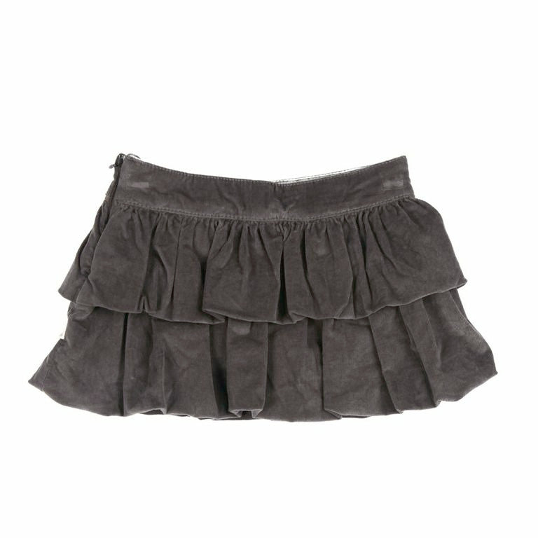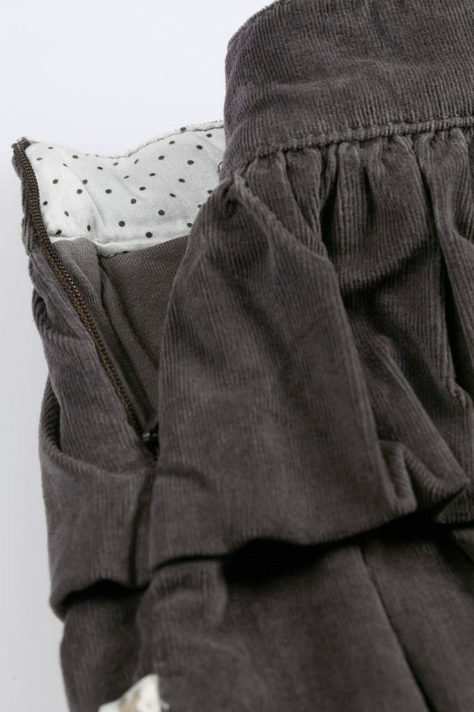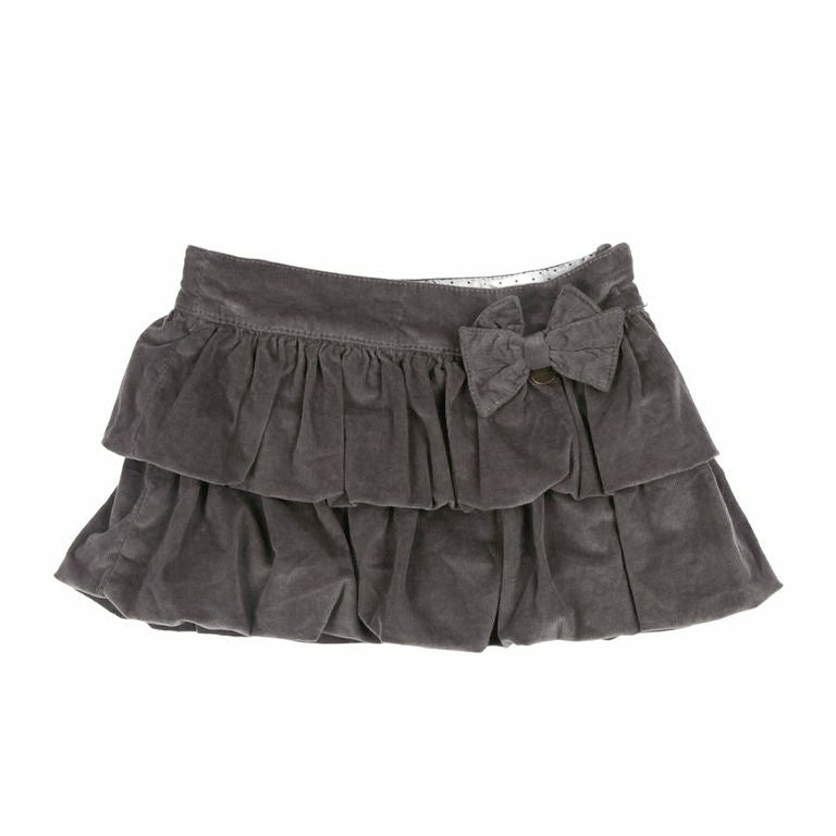 Kanz little girls bubble skirt from “Mini Kanz/London” collection. Soft brown pin stripe velvet skirt with tiered attached ruffles. Little brown attached double bow at the waistline with Kanz charm. Adjustable waistline inside and zipper on the side. Soft brown cotton lining on inner side of the skirt.