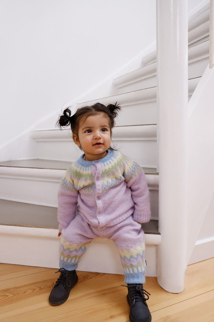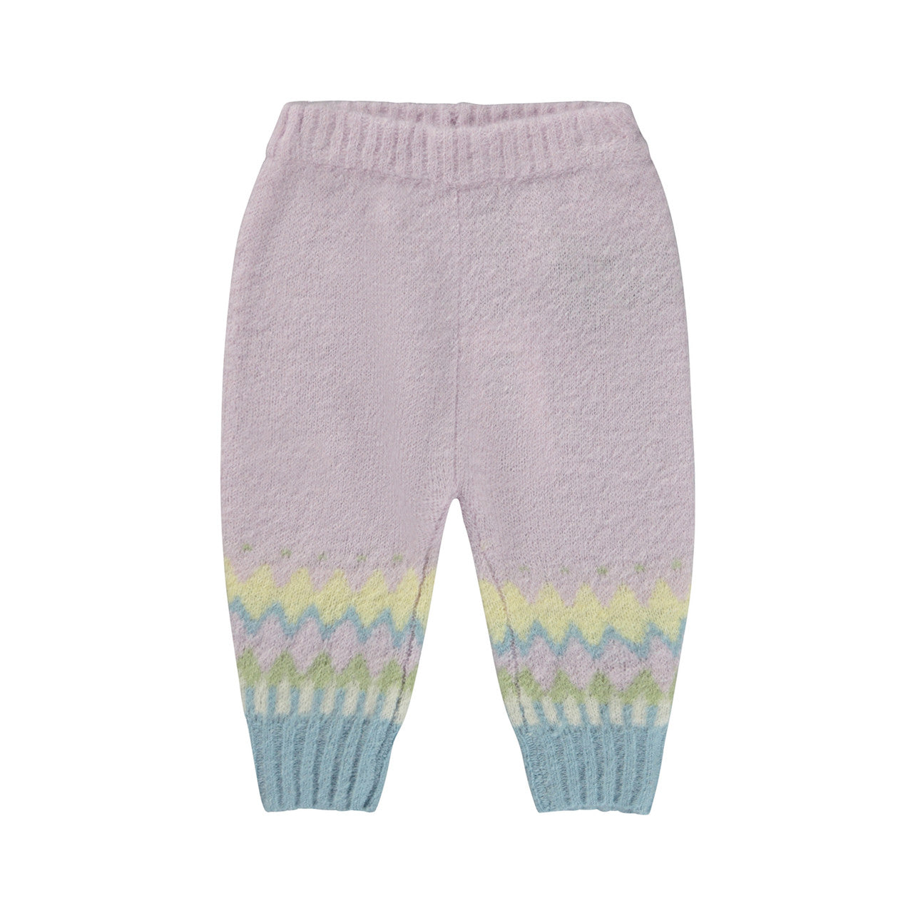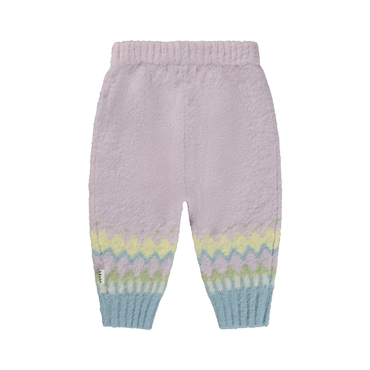 Soft and comfy knitted pants in lavender and colorful Nordic design.