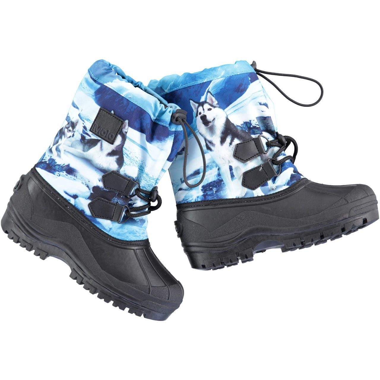 MOLO Driven snow boots - husky. Solid black water resistant runner foot and Husky printed fabric, elasticated string fastening on top and MOLO logo on side. Warm felt inner lining.