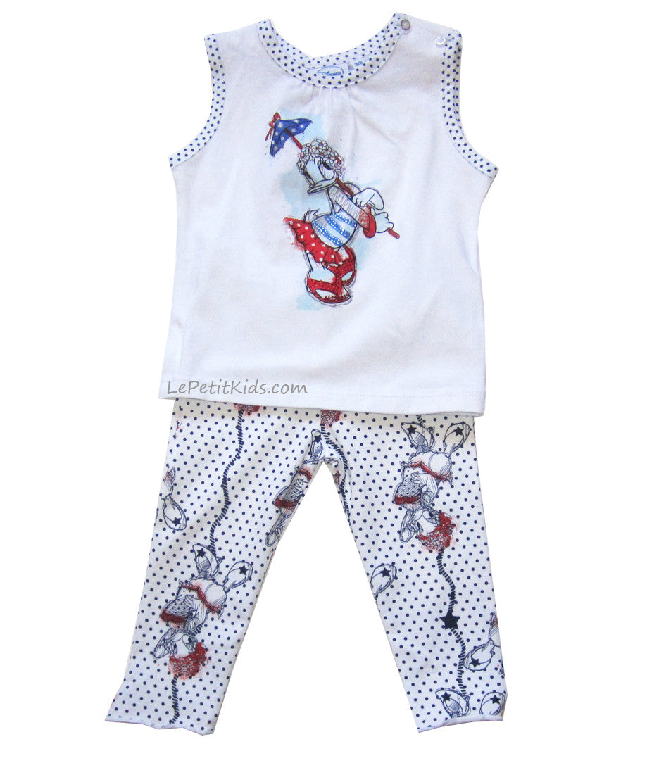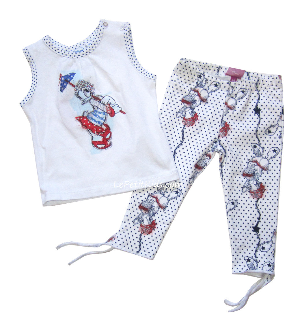 Disney 2pc top and pant set in very pale grey featuring a gorgeous Daisy Duck with a parasol on front. Printed pants with Miss Daisy and ties at ankles.